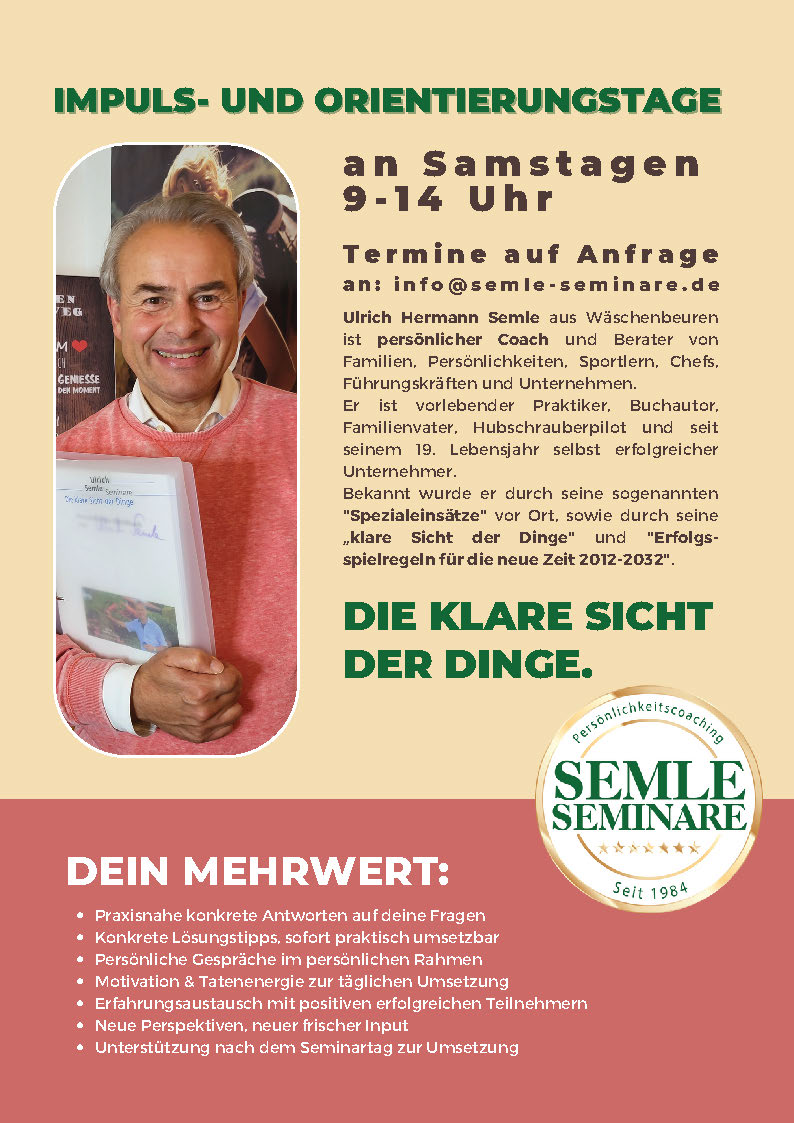 Ulrich Semle steigt wieder ein mit einem öffentlichen Event. Nach mehreren Jahren Privatcoachings möchte er wieder Perspektiven, Lebensfreude und Horizonte mit Ihnen eröffnen! Unsere inneren Weltbilder und Erfahrungen sind es, die unsere äußere Welt Tag für Tag prägen, also unsere Realität schaffen. Daher ist die Lösung in unserer Denkweise und mentalen Veränderung zu finden. Gönnen Sie sich diesen Tag und tanken Sie Mut, Hoffnung und Zuversicht!